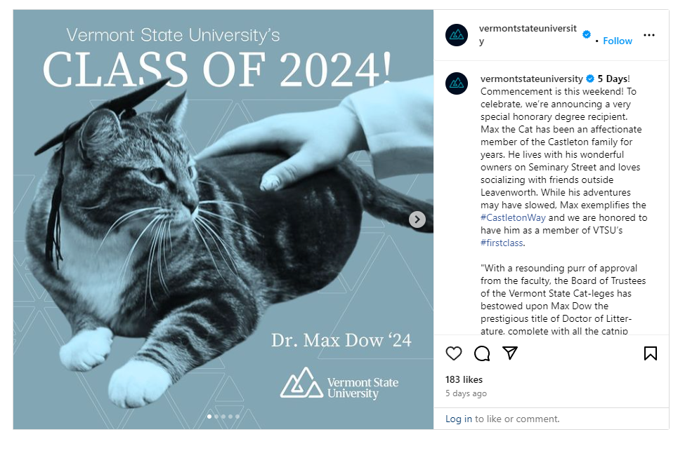 امریکی ریاست ورمونٹ میں ایک بلی کو یونیورسٹی کی جانب سے ڈاکٹریٹ کی اعزازی ڈگری سے نوازا گیا۔ ‘میکس’ نامی…