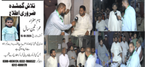 داتا دربار کے علاقہ محلہ مدینہ سڑیٹ نمبر 41 سے تین سالہ بچی غفرا ماموں کےگھرسےلاپتہ