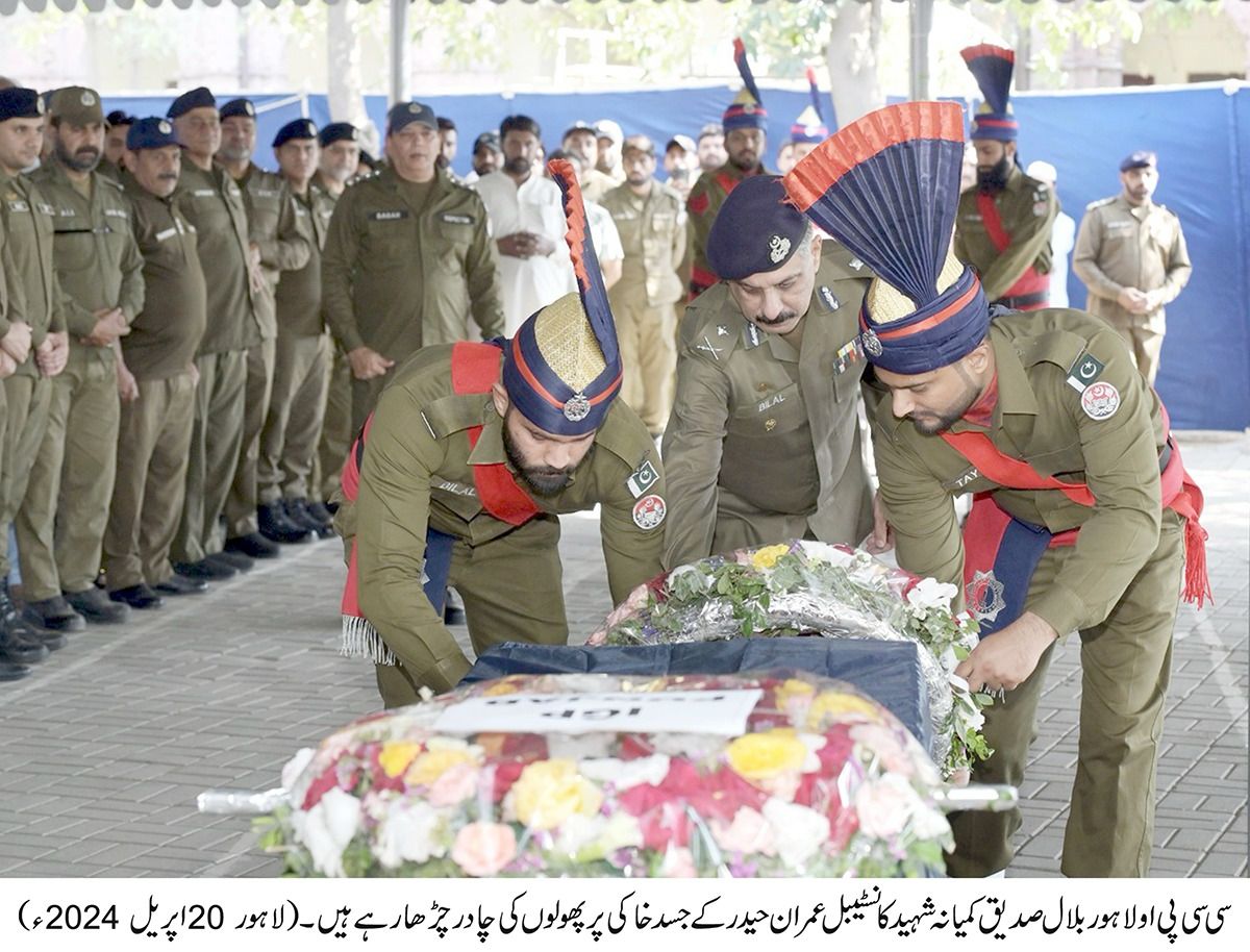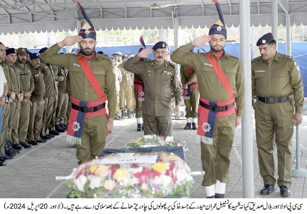 سی سی پی او لاہور نے شہید کانسٹیبل عمران حیدر کے جسد خاکی کو سلامی پیش کی، پھولوں کی چادر چڑھائی