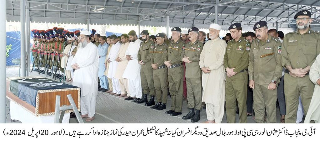 تھانہ باغبانپورہ میں تعینات کانسٹیبل عمران حیدر نے فرض کی ادائیگی کے دوران ڈاکوؤں کی فائرنگ سے جام شہادت نوش کیا