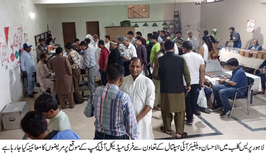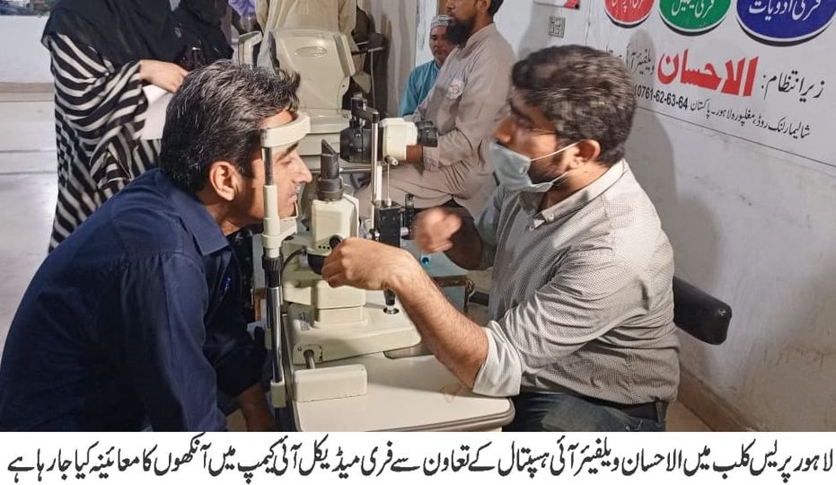 لاہور پریس کلب کی گورننگ باڈی نے الاحسان ویلفیئر آئی ہسپتال کے تعاون سے معزز ممبران اور انکی فیملیز کیلئے فری میڈیکل آئی کیمپ کا اہتمام کیا۔میڈیکل آئی کیمپ میں آئی سپیشلسٹ ڈاکٹر عاطف شمشاد ، ڈاکٹر محمد اویس ، ڈاکٹر اشعر رﺅف ، ڈاکٹر محمد اسیس، پروفیسر شاہد محمود ،محمد سعید بھٹی،محمد بلال شفیق، حافظ عتیق الرحمن ، احتشام کاکڑ سمیت پیرامیڈیکل سٹاف و ٹیکنیکل سٹاف نے شرکت کی