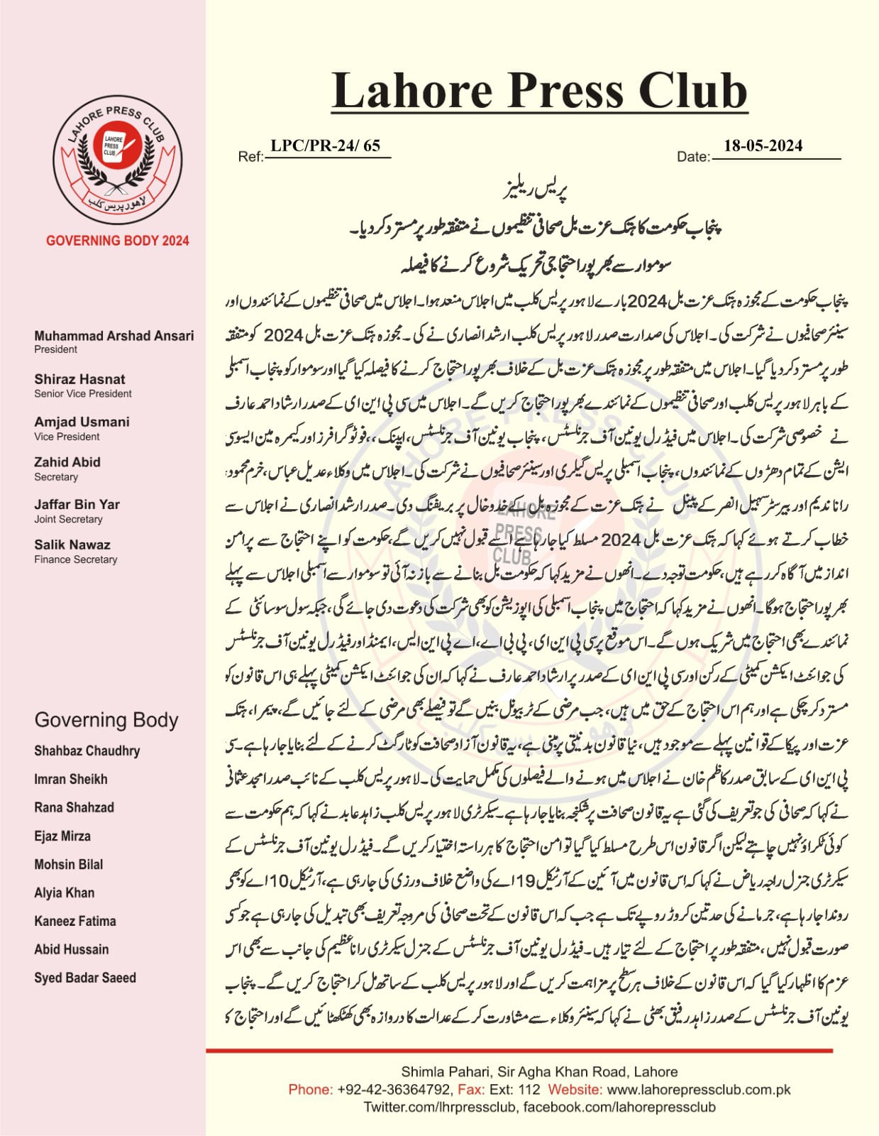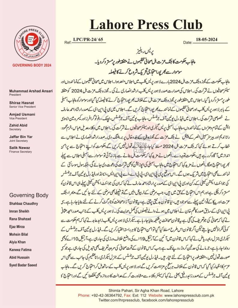 پنجاب حکومت کاہتک عزت بل صحافی تنظیموں نے متفقہ طورپر مسترد کردیا۔ سوموار سے بھرپوراحتجاجی تحریک شروع کرنے کافیصلہ