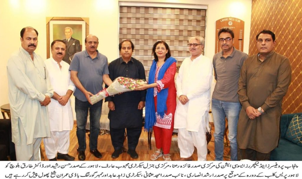 پنجاب پروفیسرز اینڈ لیکچررز ایسوسی ایشن کی مرکزی صدر فائزہ رعنا لاہور پریس کلب کے دورہ