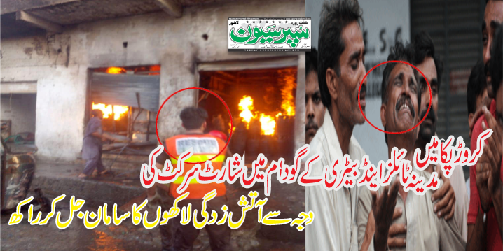 تفصیلات کے مطابق کروڑ پکا کے علاقہ مین بازار میں مدینہ ٹائل اینڈ بیٹری ہاؤس کے گودام میں لاکھوں روپے کی بیٹری سینٹری کا سامان موجود تھا کہ شام اچانک چھ بجے اگ بھڑک اٹھی لوگوں نے اپنی مدد کے تحت اگ پر قابو پانے کی بہت کوشش کی مگر اگ پر قابو نہ پا سکے1122کو اطلاع کی جب آئے تو تمام سامان راک بن گیا تھا کبھی پانی ختم کبھی گاڑی خراب بس ہم روتے ہیں اپنی قسمت پر