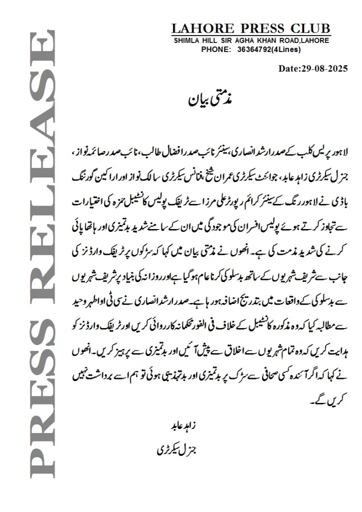 لاہور پریس کلب کے صدر ارشد انصاری، سینئر نائب صدر افضال طالب، نائب صدر صائمہ نواز، جنرل سیکرٹری زاہد عابد، جوائنٹ سیکرٹری عمران شیخ،فنانس سیکرٹری سالک نواز اور اراکین گورننگ باڈی نے لاہور رنگ کے سینئر کرائم رپورٹر علی مرزا سے ٹریفک پولیس کانسٹیبل حمزہ کی اختیارات سے تجاوز کرتے ہوئے پولیس افسران کی موجودگی میں ان کے سامنے شدید بدتمیزی اور ہاتھا پائی کرنے کی شدید مذمت کی ہے۔ انھوں نے مذمتی بیان میں کہا کہ سڑکوں پر ٹریفک وارڈنز کی جانب سے شریف شہریوں کے ساتھ بدسلوکی کرنا عام ہوگیا ہے